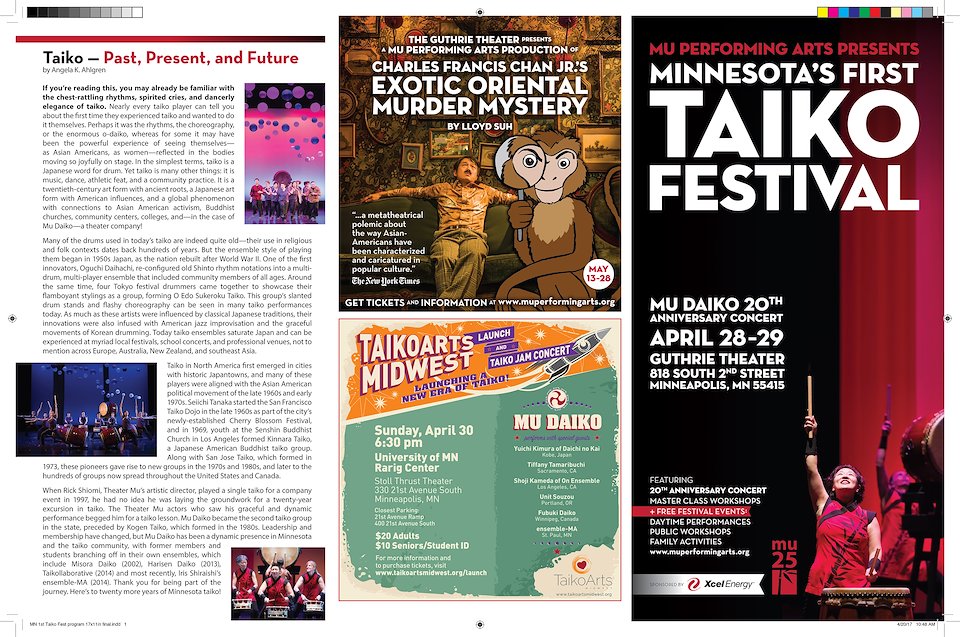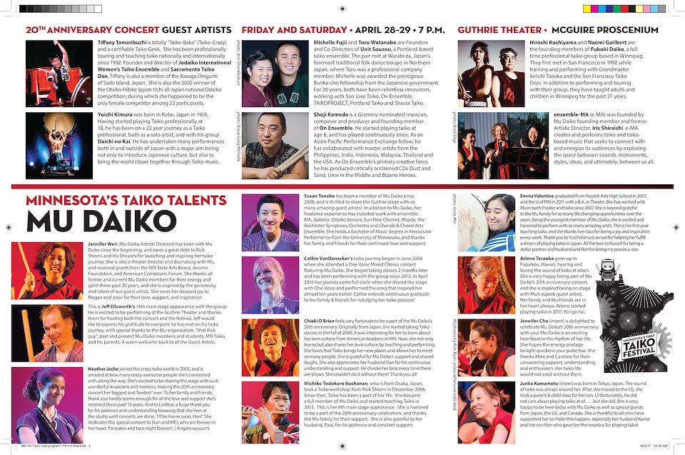 TaikoArts Midwest is a Minnesota based world class taiko ensemble who delivers loud, energetic performances that combine music, dance, culture, and pure athleticism. Taiko is the Japanese word for drum and refers to the modern style of playing these drums. Wadaiko (in Japan) and kumi daiko (in North America) is movement infused, heart-pounding, dynamic group drumming.